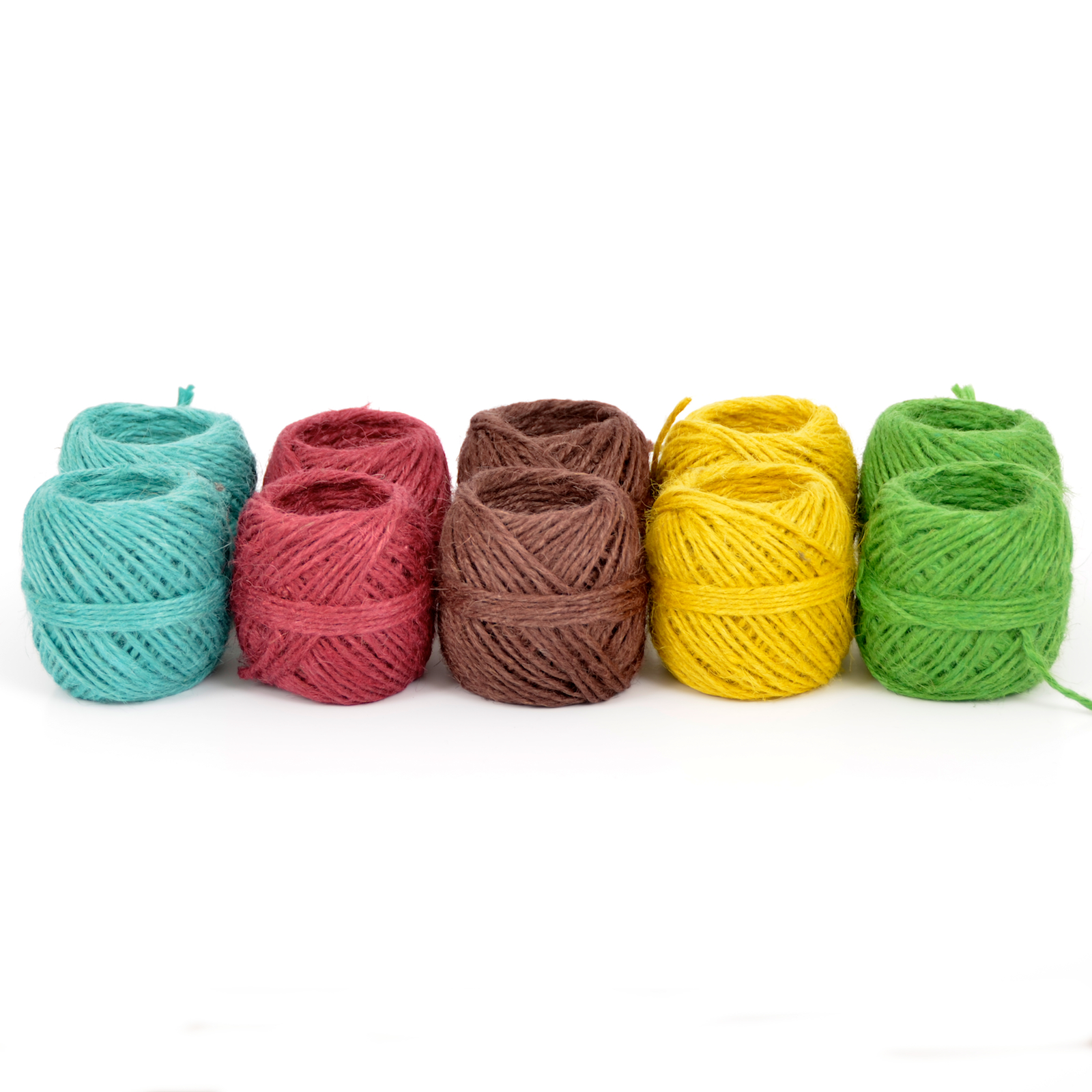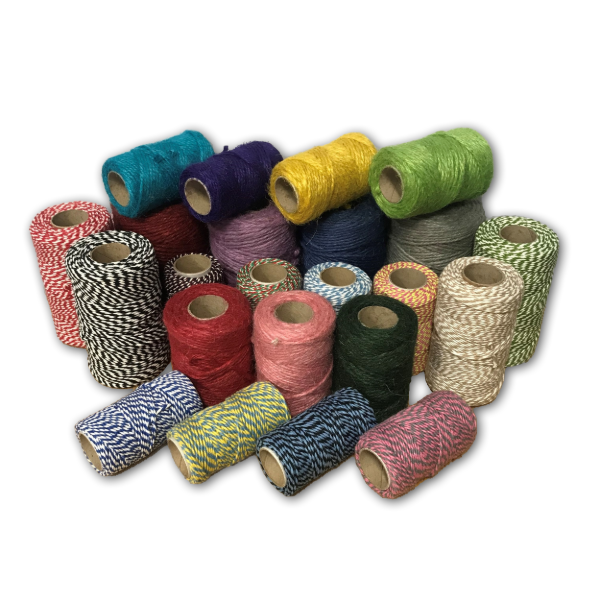 An assorted pack containing short lengths/untwisted yarns of coloured cotton Macrame twines, Baker’s twines and Jute craft twines.